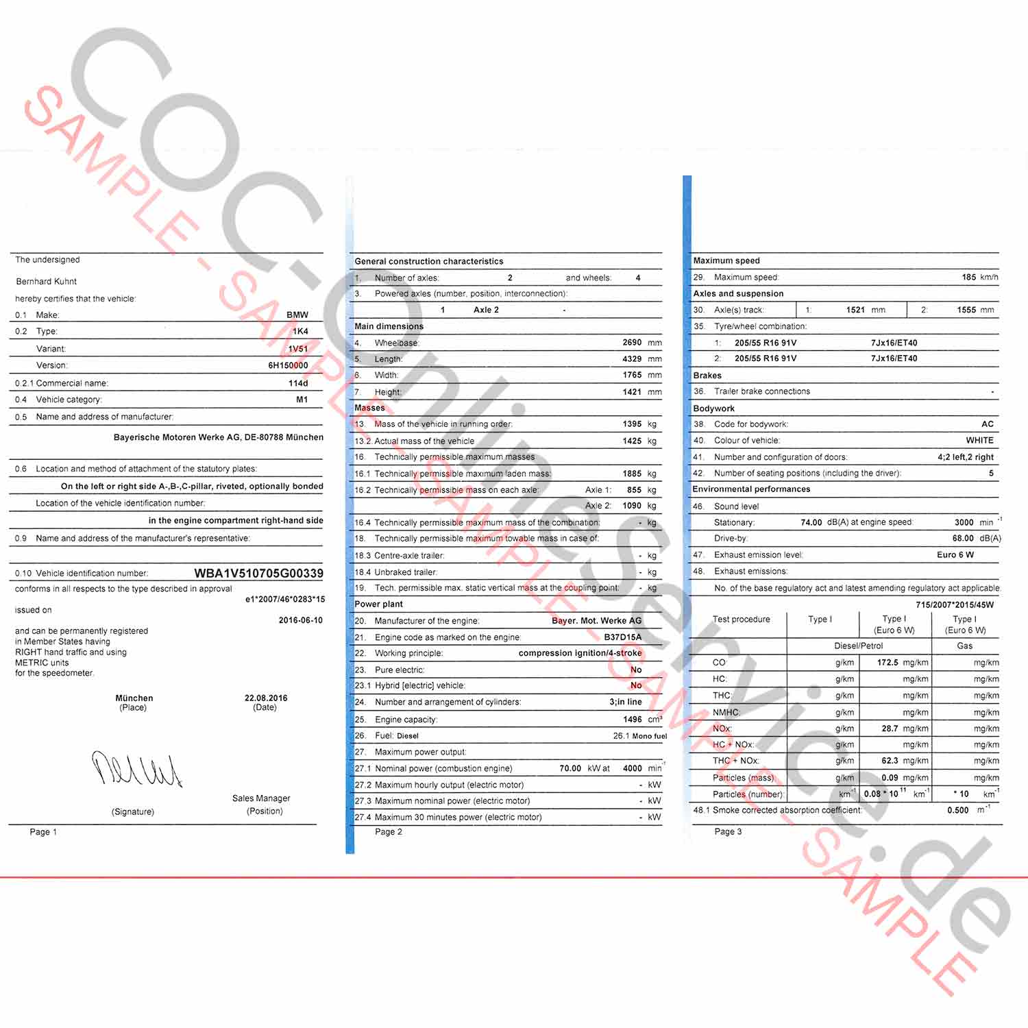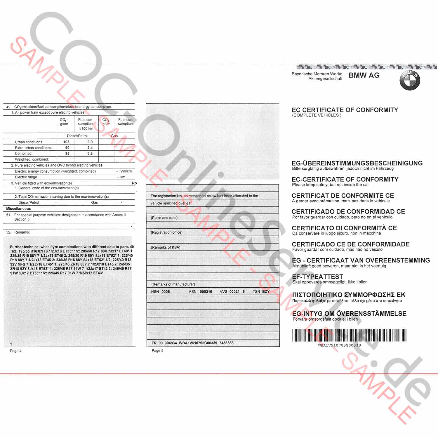 Sie erwerben ein authentisches BMW-Konformitätszertifikat (COC) ausgestellt vom Fahrzeughersteller BMW, das die Übereinstimmung Ihres Fahrzeuges mit den europäischen Normen bescheinigt. Mit diesem COC-Dokument können Sie ihr Fahrzeug in allen Ländern des Europäischen Wirtschaftsraums (EWR) offiziell zulassen.