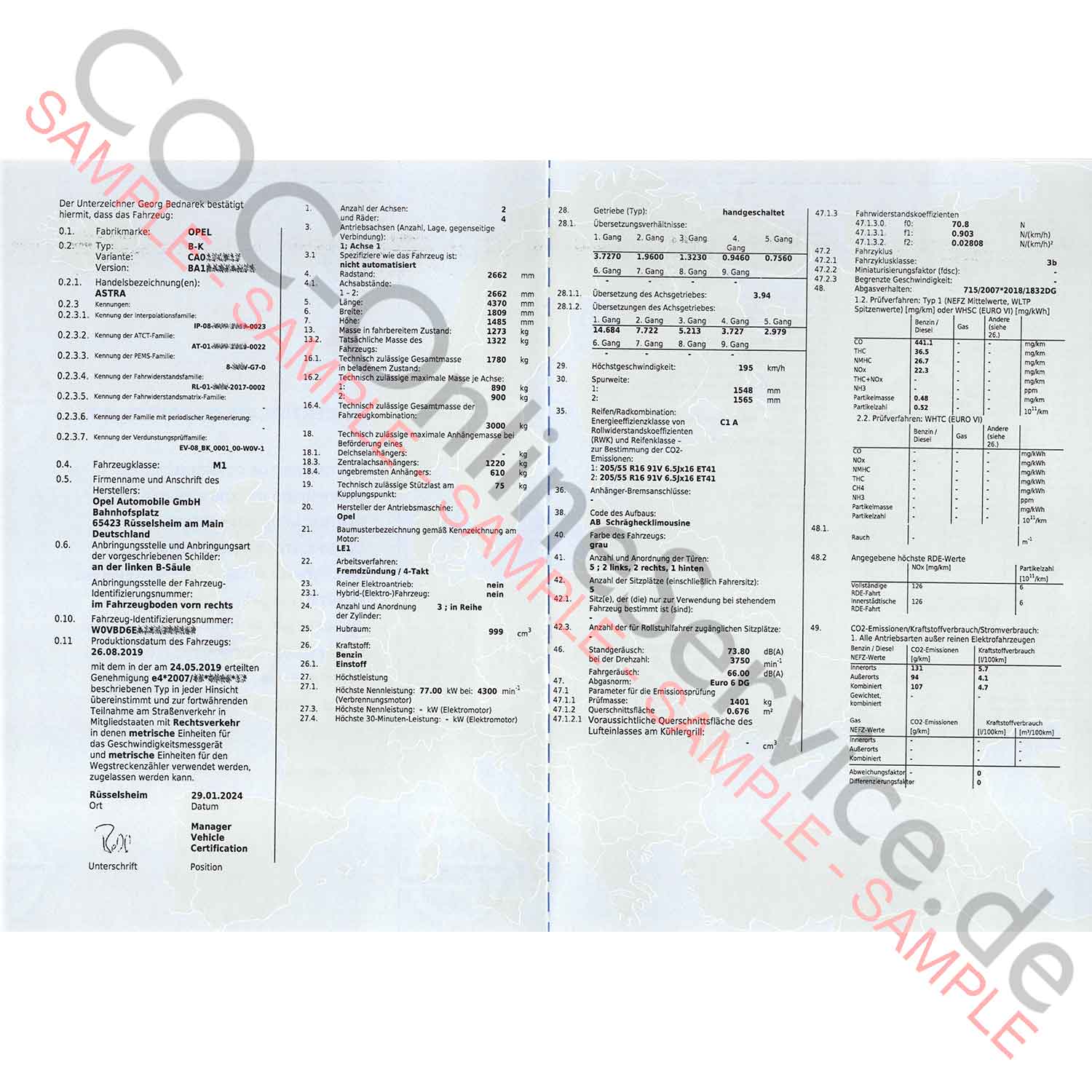 Gdy tylko dokument zostanie sporządzony przez producenta pojazdu, otrzymasz wiadomość e-mail z plikiem PDF COC. Dzięki tej kopii można w wielu przypadkach zarejestrować pojazd lub przeprowadzić przegląd techniczny. Oryginał dokumentu zostanie wysłany pocztą lub przesyłką ekspresową.